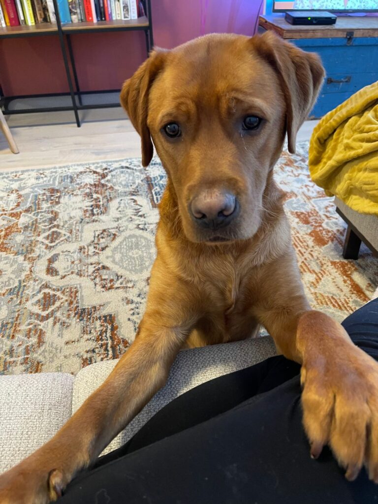 Bowie de Labrador van 10 jaar heeft wat meer moeite, haha die denkt ja hè wat is dat allemaal in ineens??